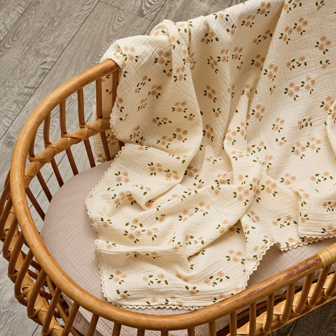 This soft and breathable swaddle is made from 2 layers of GOTS certified organic muslin, with a sweet lace trim. As soft as a cloud and perfect for wrapping baby in, as muslin is lightweight and warm.